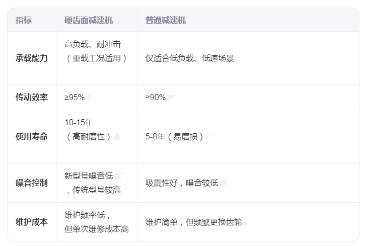硬齒面減速機(jī)與普通減速機(jī)(通常指軟齒面減速機(jī))的核心區(qū)別主要體現(xiàn)在齒輪材料、工藝、性能及應(yīng)用場(chǎng)景等方面,具體差異如下: